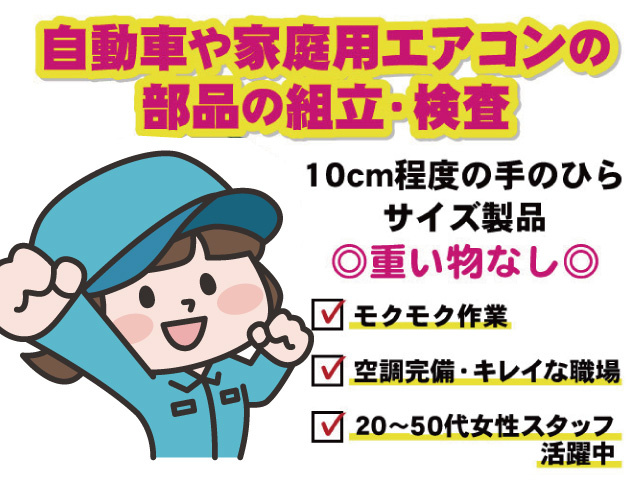 【自動車や家庭用エアコンの部品の組立・検査】日勤&土日休みなので家庭と仕事の両立も可能です。