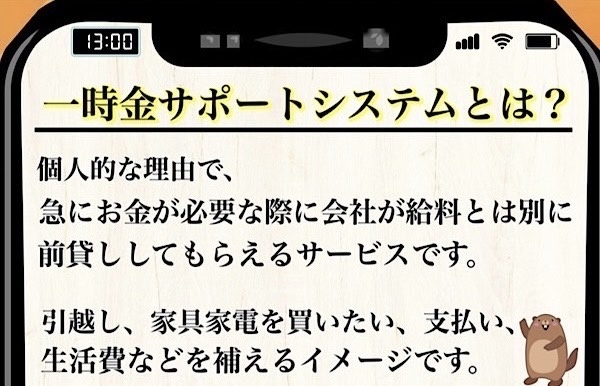 個人的な理由で、急にお金が必要な際に会社が給料とは別に前貸ししてもらえるサービスです。