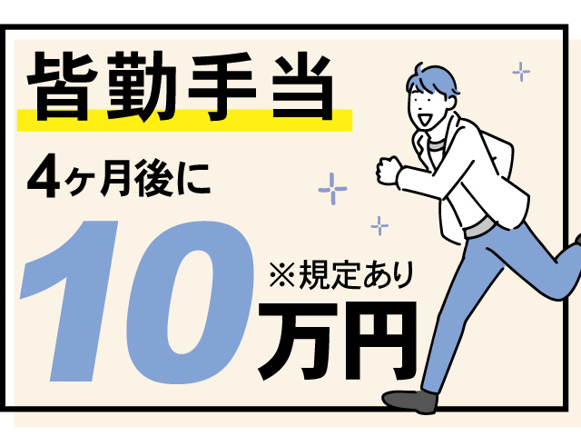 ◎皆勤手当/毎月出勤率90%以上で4ヶ月後に10万円がもらえます ※規定あり
