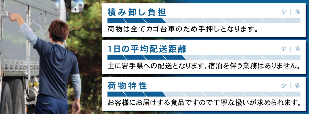 中型免許は必要ですが、配送件数が少なくカゴ台車での作業なので、ドライバー経験が無い方でも始めやすい仕事だと思います。安定した環境で長く働きたい方には、ぜひおすすめしたい職場です。