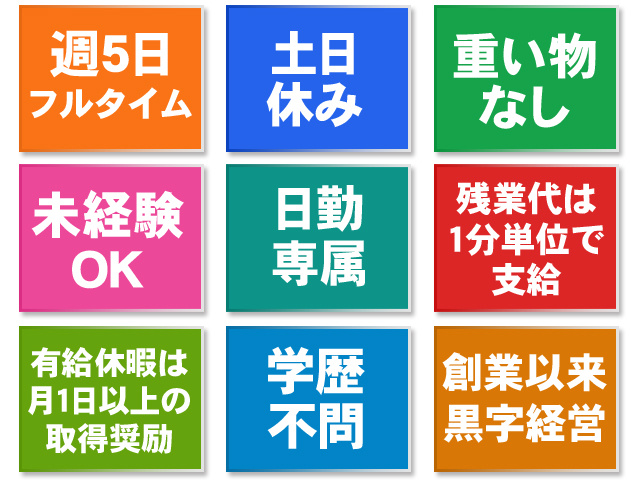 - 社会保険完備(健康保険、厚生年金、雇用保険、労災保険)