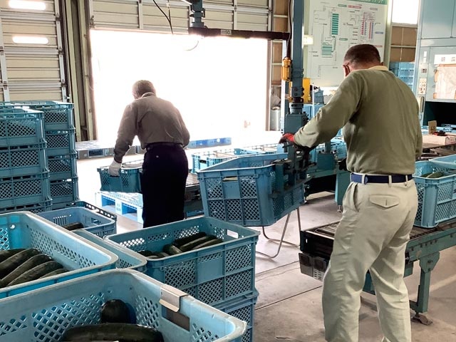 生産者が持ち込んだ青果物入コンテナの移動・レーン乗せ