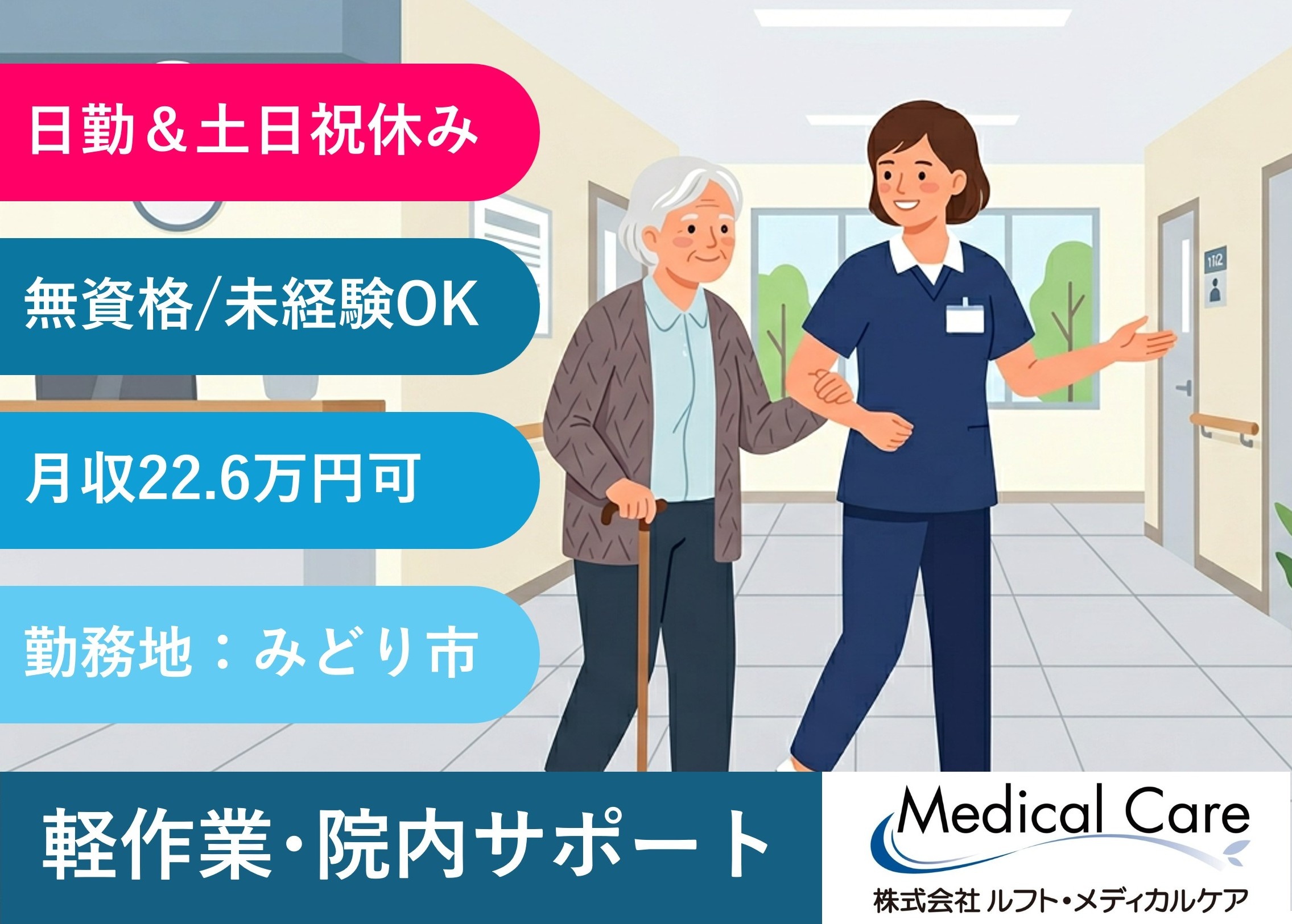 群馬県みどり市【軽作業・院内サポート/日勤・土日祝休み/無資格・未経験OK】シーツ交換・食事配下膳・身体介助・移送・メッセンジャー業務他の募集内容