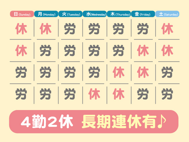 - ・4勤2休(シフト制)
