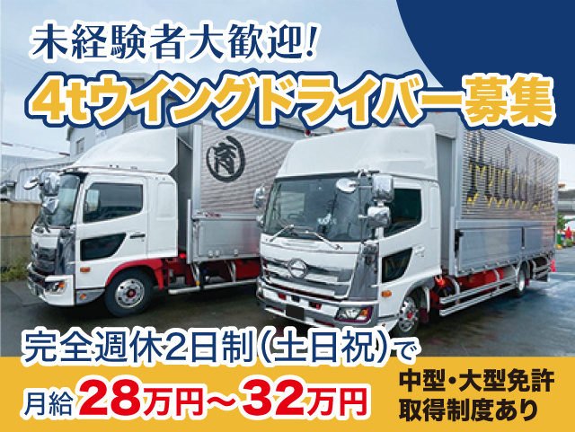 - 4tウイング車での梱包資材の地場・中距離配送です(全線高速道路使用)。