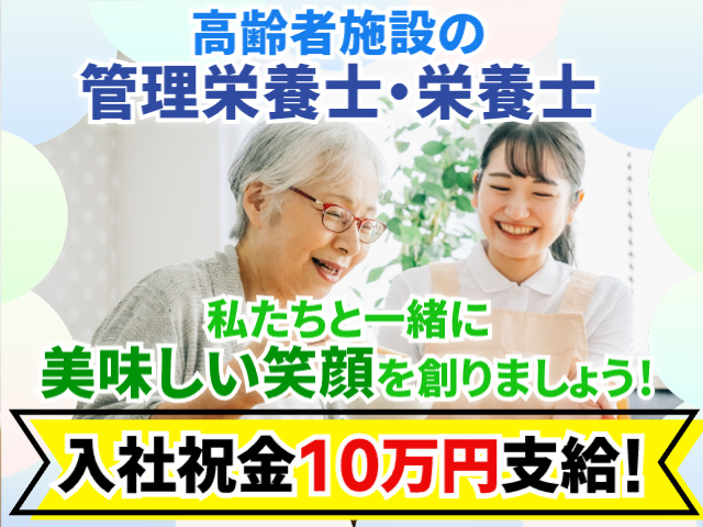 【入社祝金10万円支給】管理栄養士・栄養士資格必須/基本日勤&土日祝休み/車通勤OK/昇給・賞与有