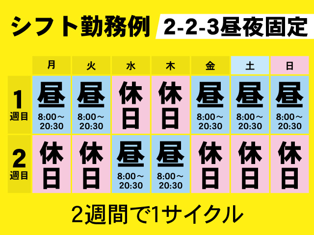 ・月曜(休日)・火曜(休日)・水曜(出勤)・木曜(出勤)・金曜(休日)・土曜(休日)・日曜(休日)